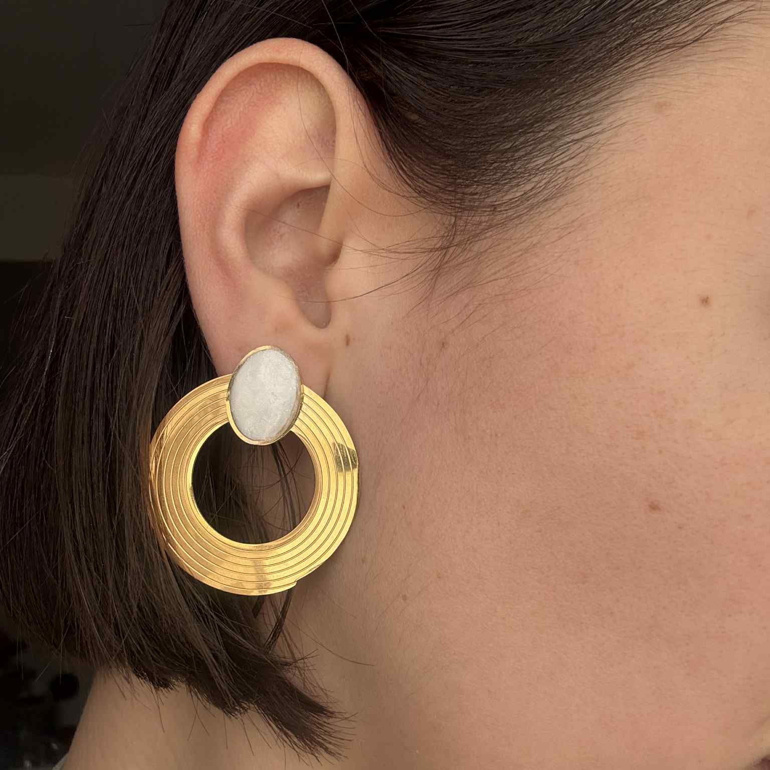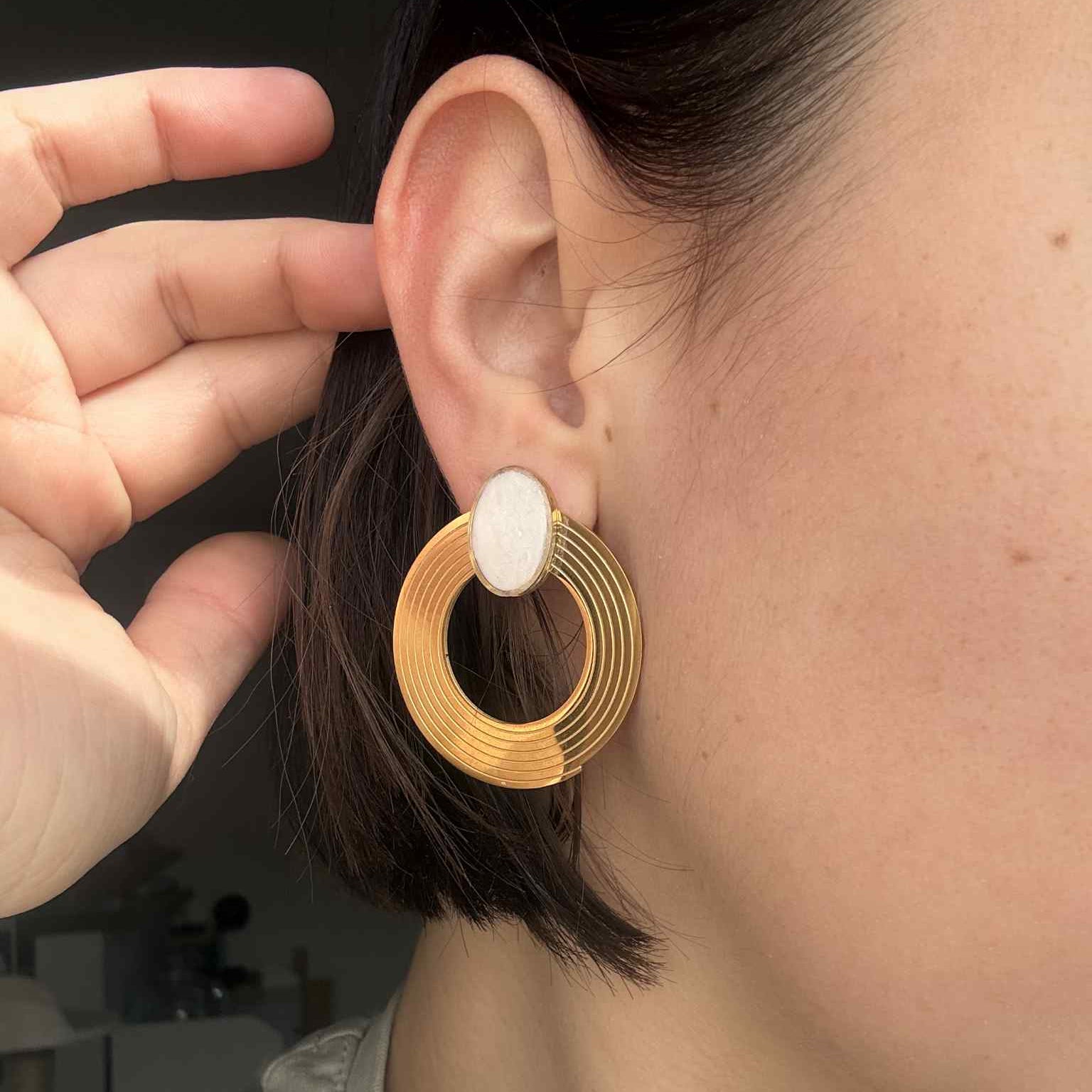 Boucle d'oreille en acier inoxydable avec rond blanc nacré en argile polymère recouvert d'une couche de résine.